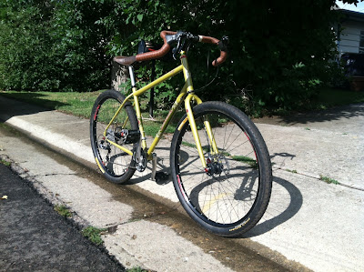 Danny Mc bought this Fargo on eBay, and brought it to me for a build, with some changes from the equipment with which it arrived. I sourced an external bearing bb for his XT cranks, swapped the bar out for a Woodchipper I had in my shop, removed the Conti tires and replaced them with my Stan's Crows, hooked everything up and battened down the hatches on the bar wrap with some hipster duct tape (hemp twine). The pedals came from Velo Swap, a few years ago. I had aleready passed them on to Danny, and he decided to use them on this bike. Nice riding rig, and the only bike I have ever put the Woodchipper on where it felt good!